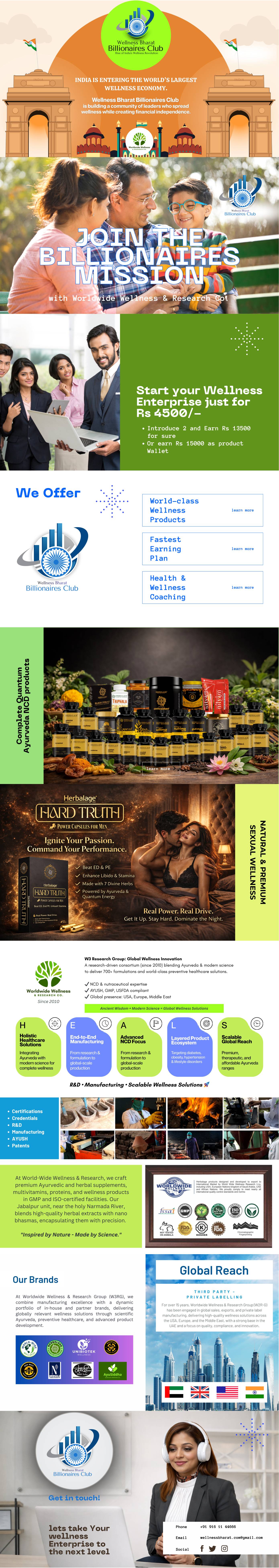Wellness Bharat was incorporated to take lead in the predicted (Presently 3 Trillion US$ global) next TRILLION DOLLAR Wellness Industry. We commenced our business in 2007 by introducing world-class Herbal Dietary supplements, mainly developed by World's oldest & largest Ayurveda R&D center.
